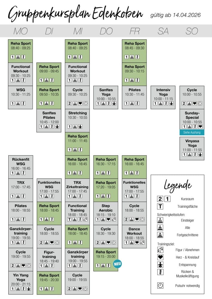 Testen Sie sich durch unser Kursprogramm und überzeugen Sie sich selbst von Kursen wie, Aroha, Cycle, Reha Sport, Step Aerobic, TRX, Zumba und vielen mehr.