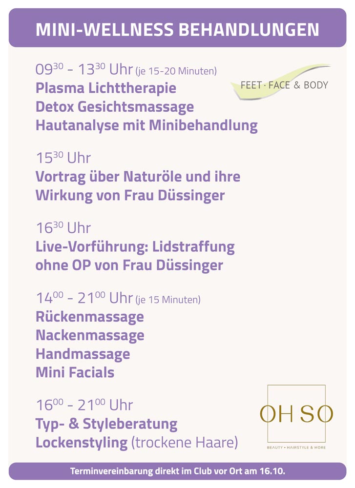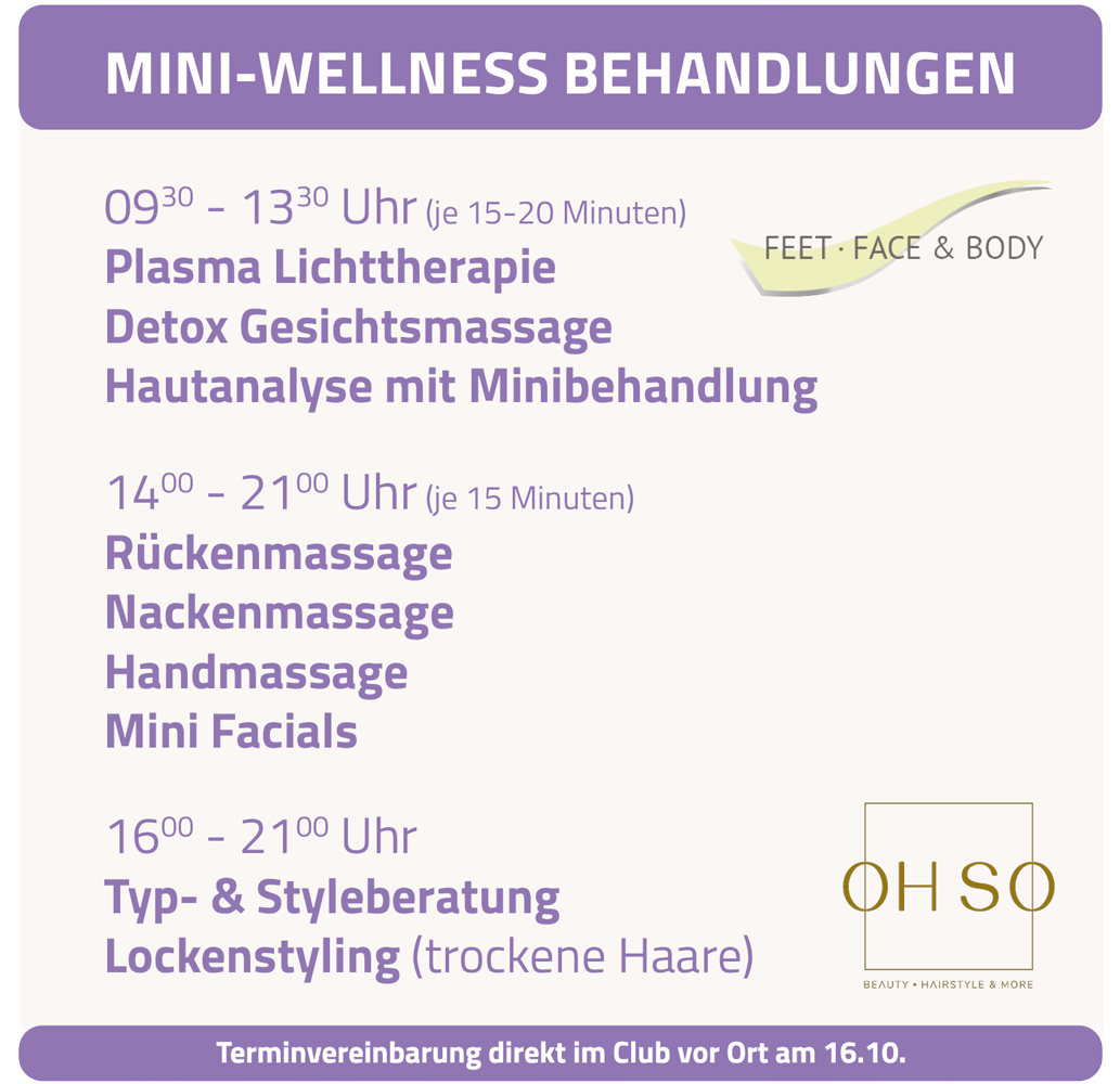 Für die Mini-Wellness-Anwendungen melden Sie sich am 16.10. vor Ort im Club an.